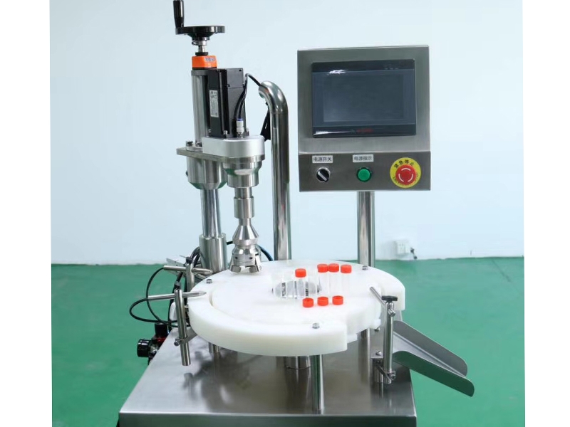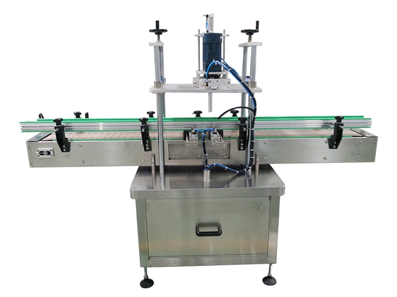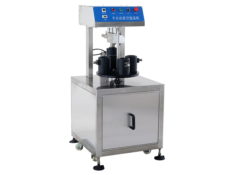 半自動旋蓋機由旋蓋機、旋蓋頭、多檔變壓器三部分組成,便于隨身攜帶。工作時,旋蓋頭罩在瓶蓋上方,旋蓋頭與旋蓋機相連,按動開關,旋蓋頭旋轉,稍向下用力,0.3-0.5秒鐘即可將瓶蓋旋緊。